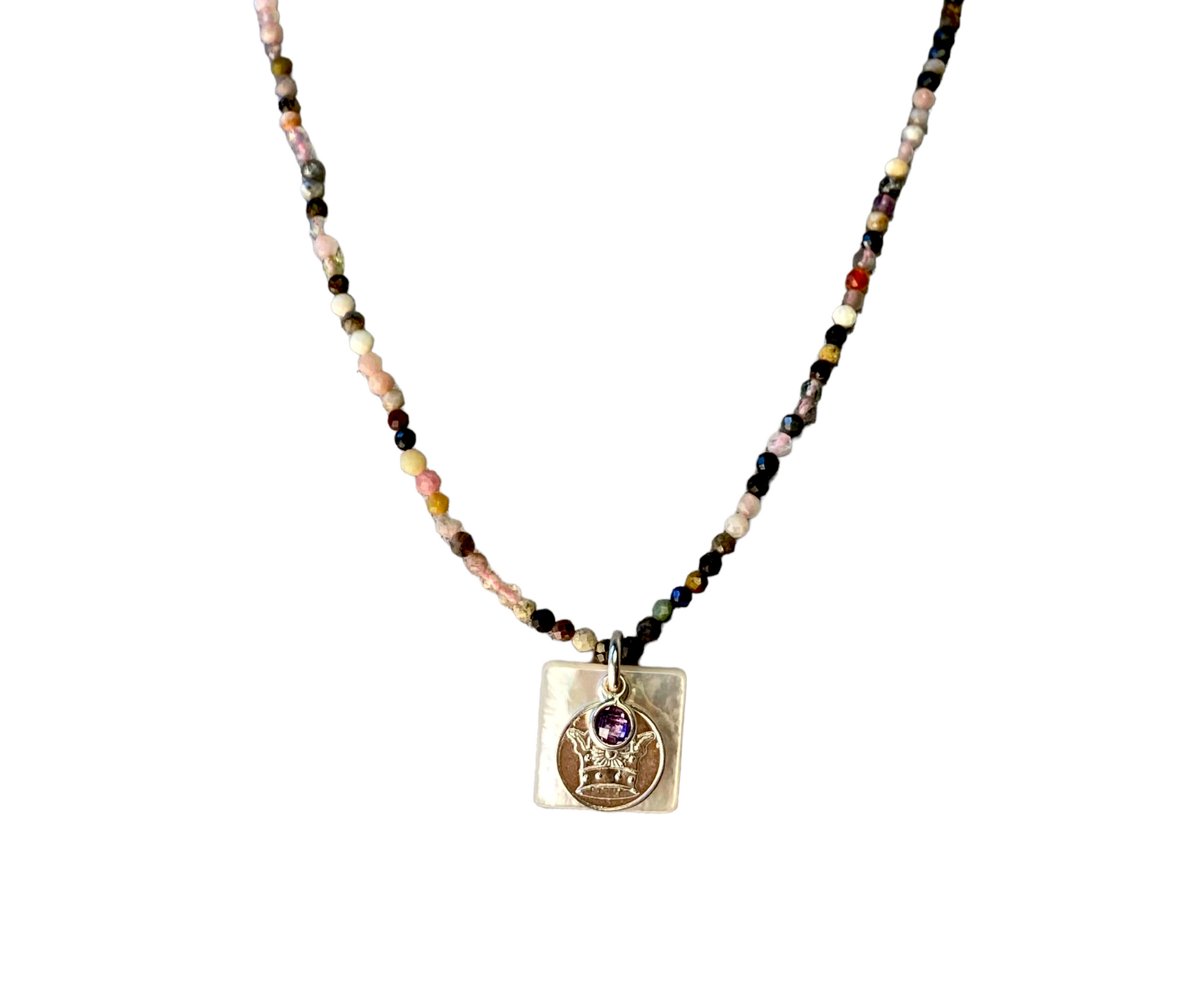 Seit Jahrtausenden nutzt der Mensch Muscheln als Ausgangsmaterial für Schmuck z. B. als Perlenlieferant, Souvenir und früher auch als Muschelgeld. Diese einzigartige handgemachte Kette mit einer alten Muschel-Tafel und schönen Steinen sorgt für ein originelles Design.