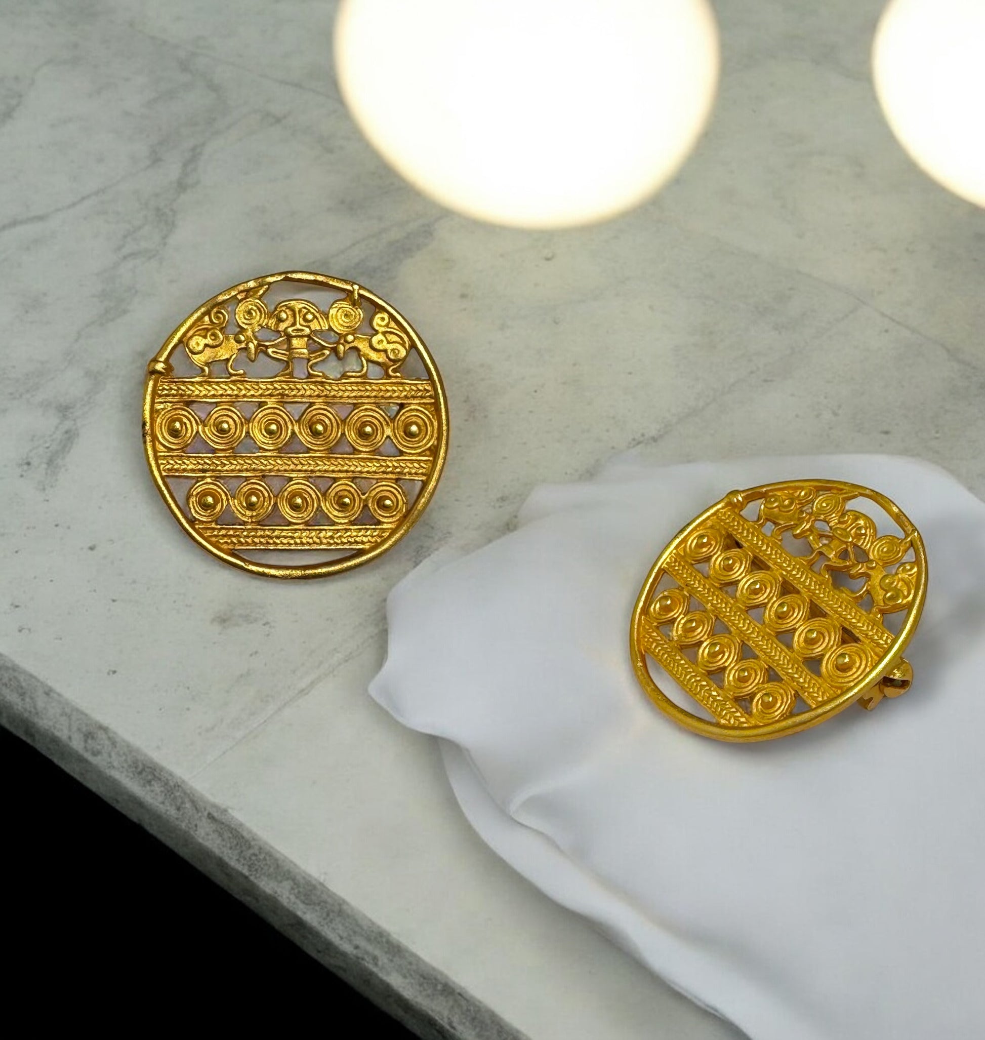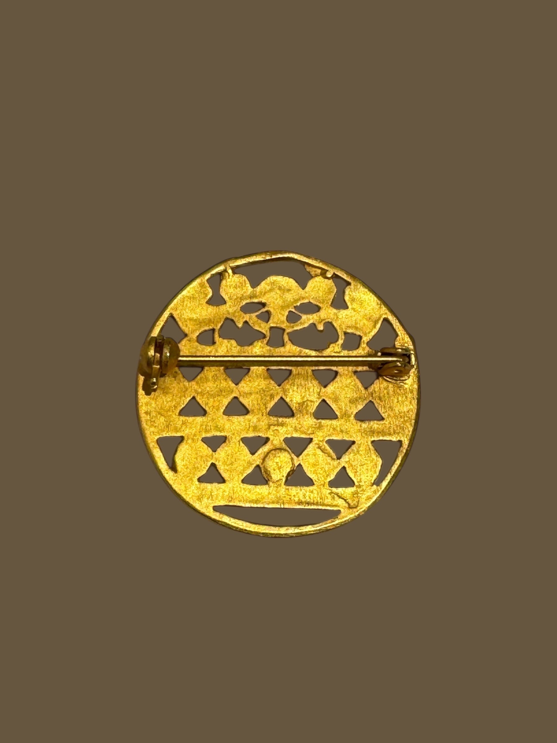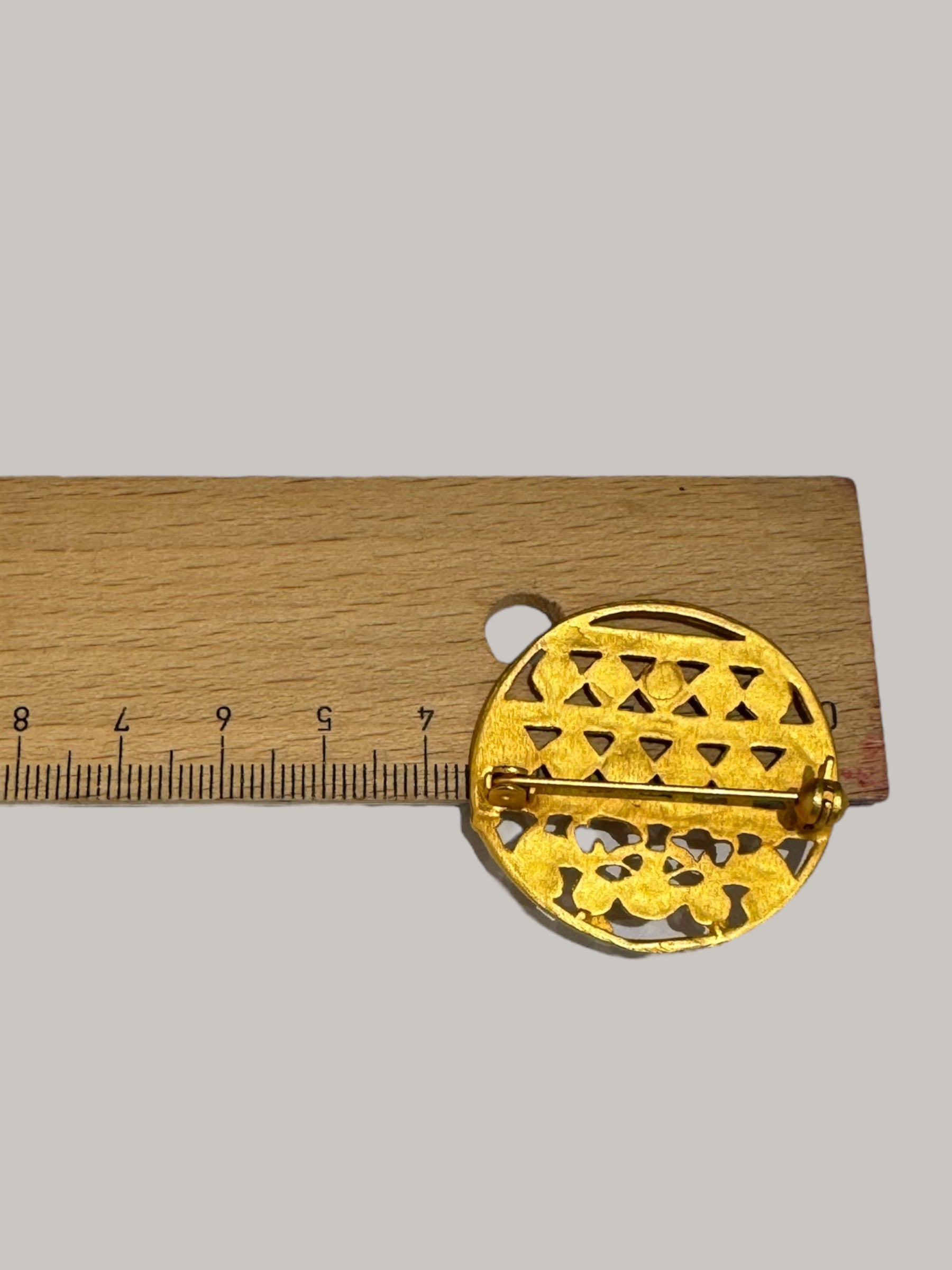 Diese wunderschöne Brosche im antiken Design spiegelt die Kunstfertigkeit vergangener Zeiten wider. Die filigranen Details und das goldene Finish verleihen ihr einen zeitlosen Charme.