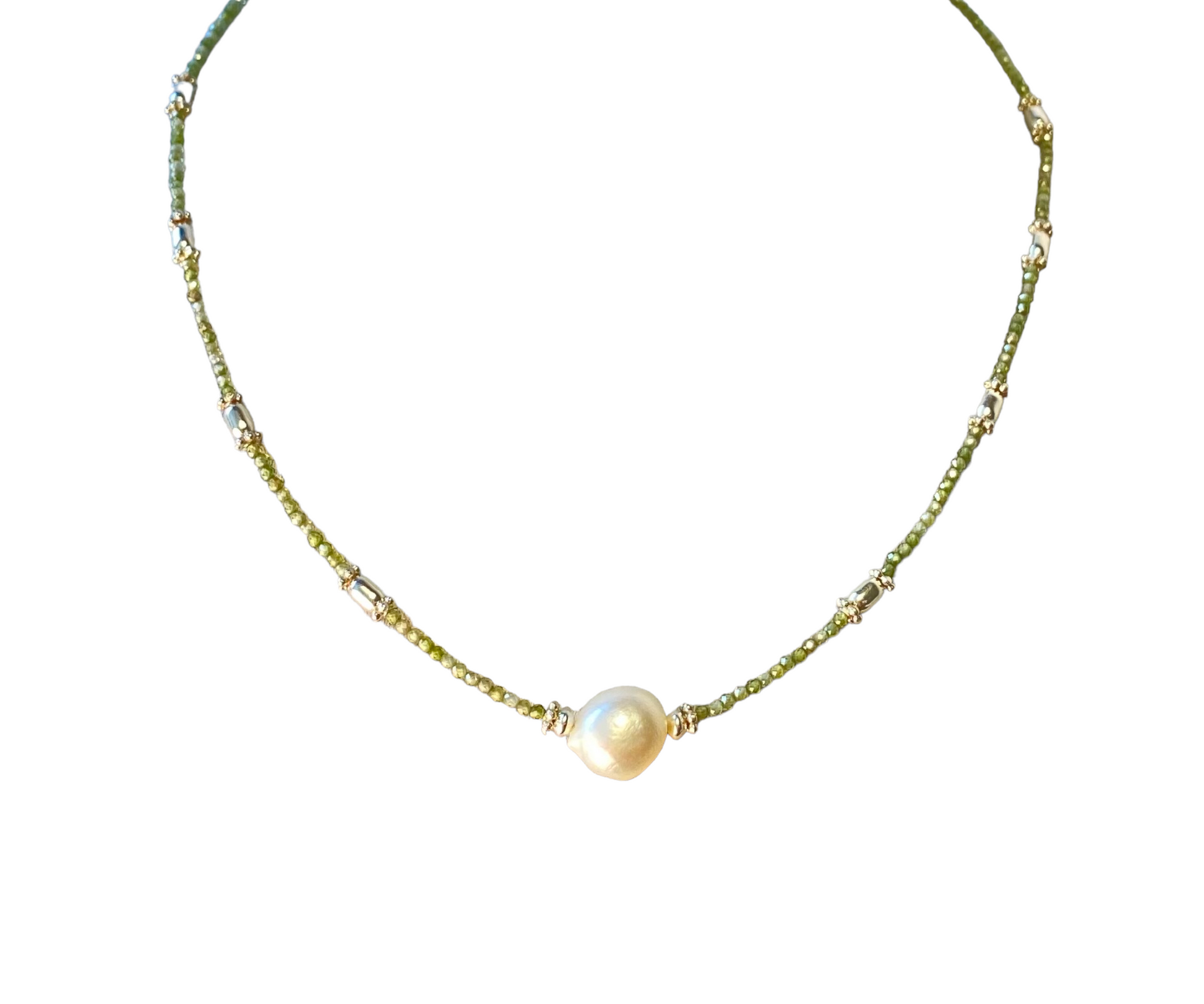Diese einmalige handgemachte Kette enthält eine wunderbare Perle, welche zur Schönheit dieser Arbeit beiträgt und gemeinsam mit den Peridotsteinen für ein originelles Design sorgt.