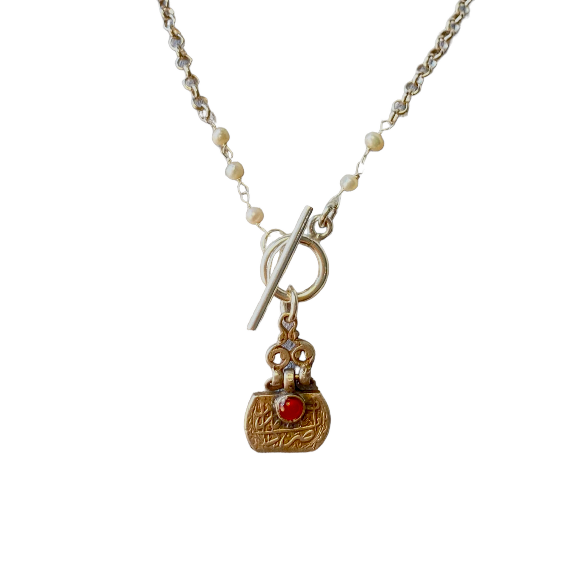 Vintage ist eine Stilrichtung in Mode und Design. Diese einzigartige handgemachte Kette mit einer alten Tafel und schönen Jadesteinen und Perlen sorgt für ein originelles Design.