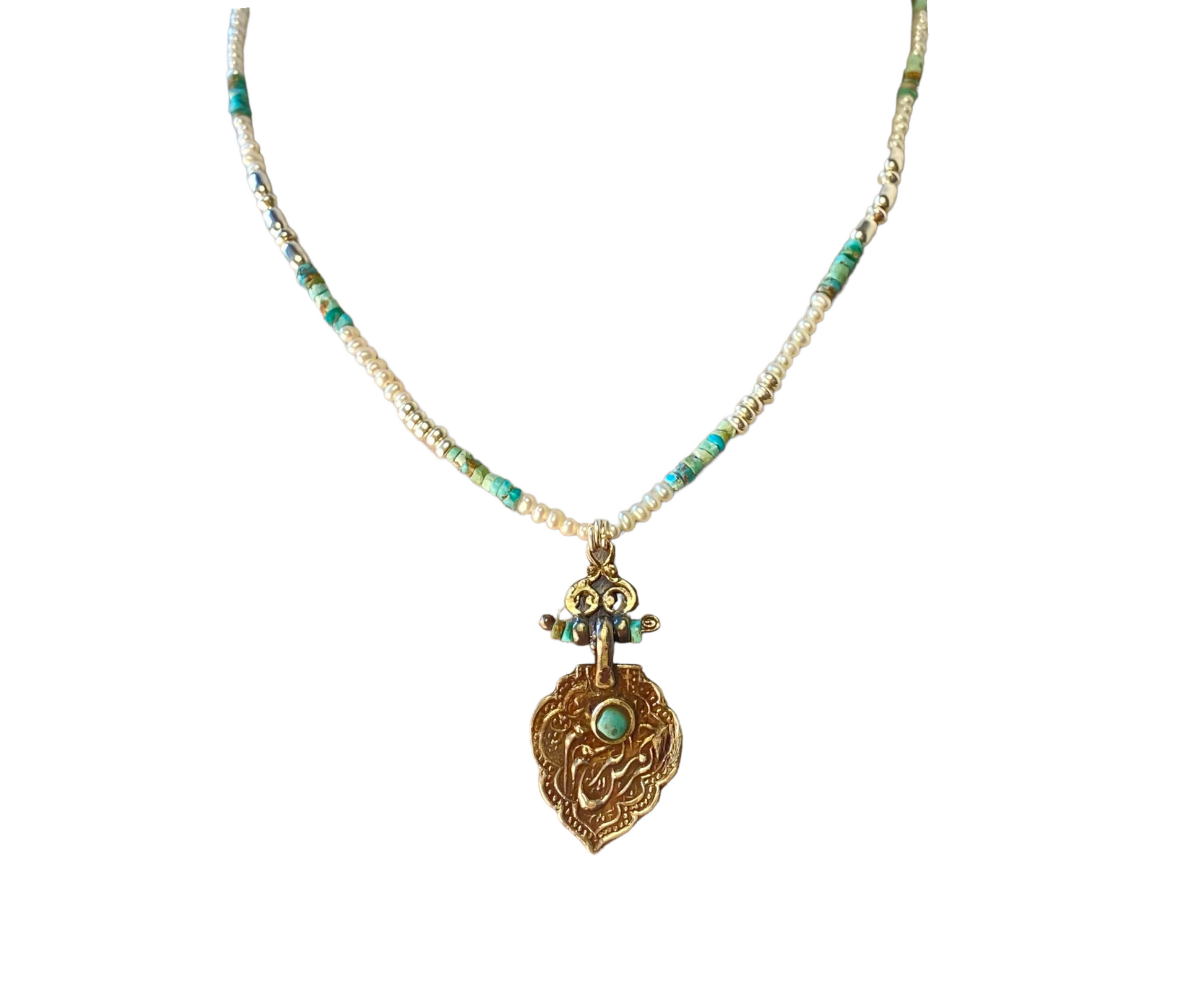Vintage ist eine Stilrichtung in Mode und Design. Diese außergewöhnliche handgemachte Kette mit einer alten Tafel und schönen Türkissteinen sorgt für ein originelles Design.